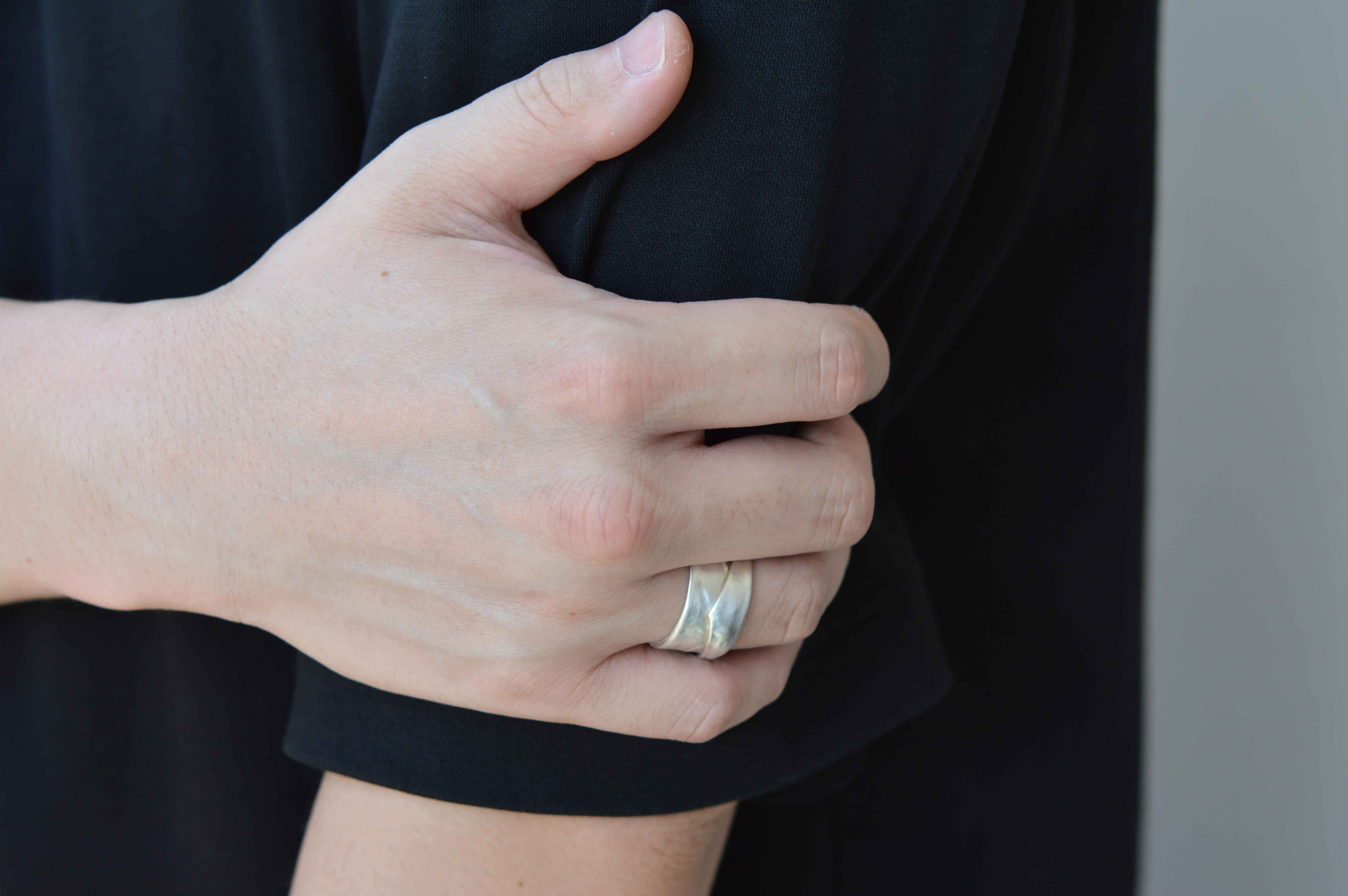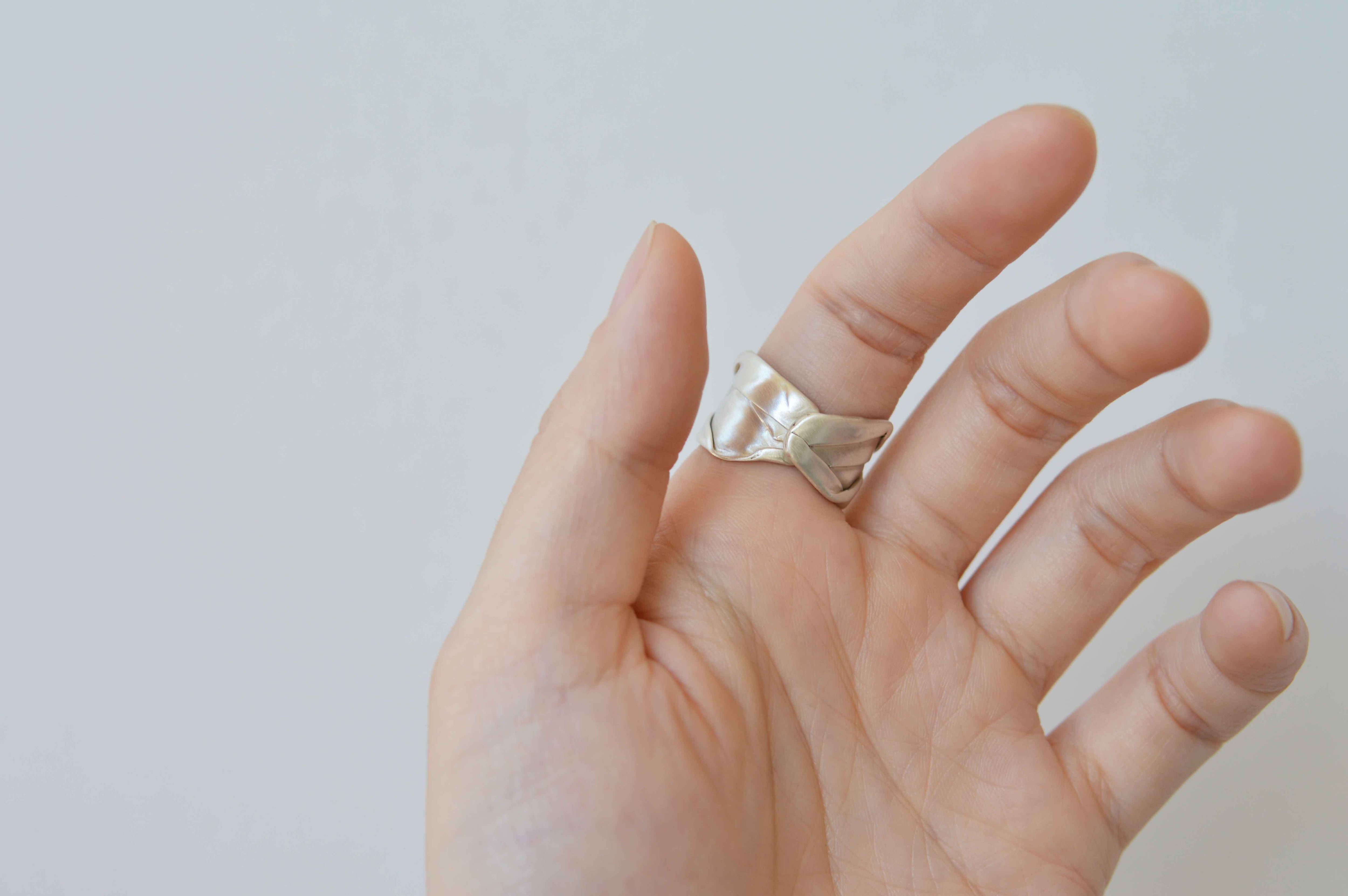 幅のあるリングのため取り外しの際に調整ができるよう、フリーサイズデザインにしています。(大きなサイズ変更はできませんのでご注意ください。)