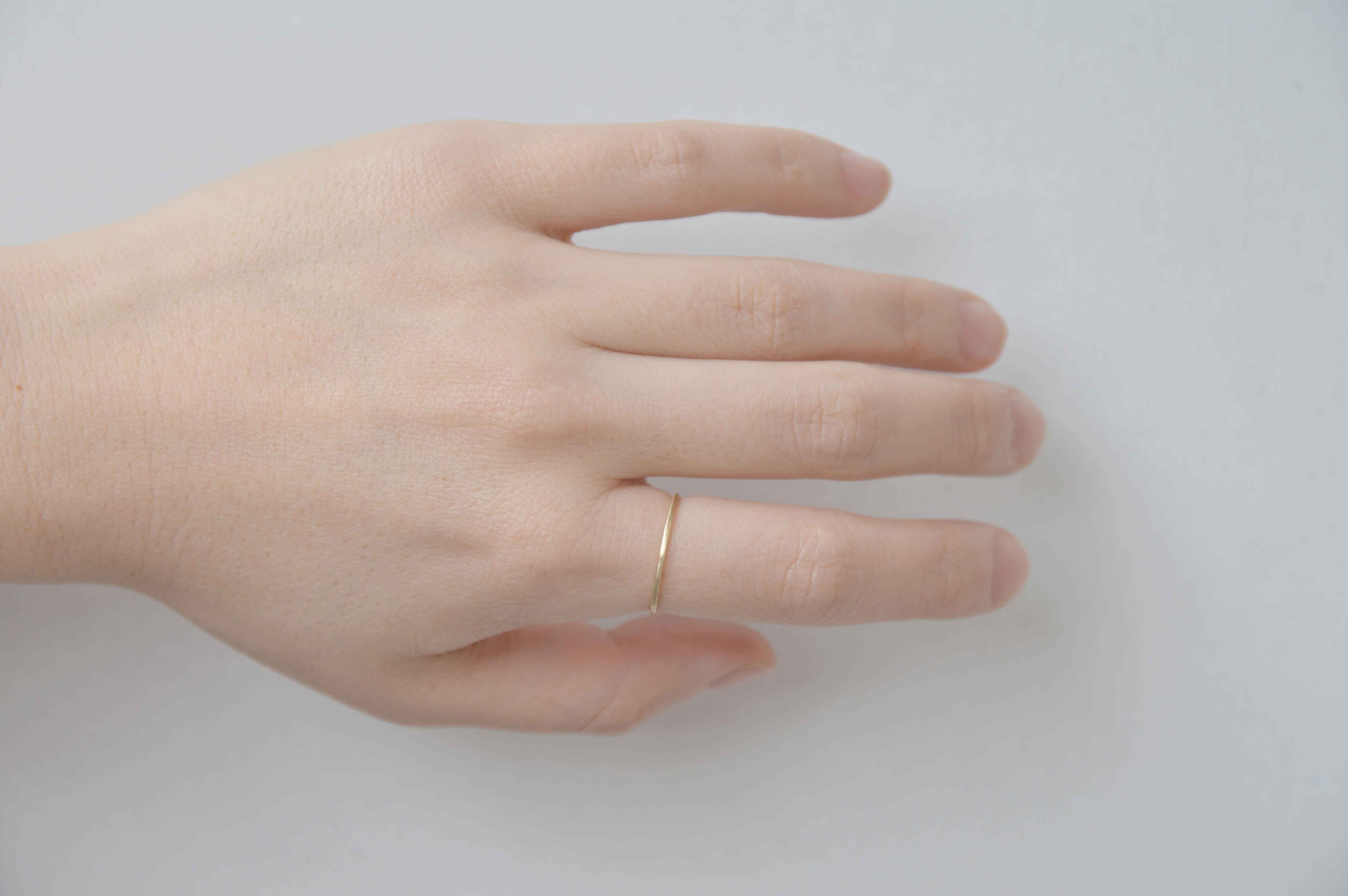 ※加工により金属を締めることで強度を高めていますが、線径の細さゆえ変形には弱いです。リングを着用したまま重たい荷物を持つなど、過度に力が加わると変形する場合がございます。もし変形してしまった場合でも修理は可能ですので、ご相談ください。