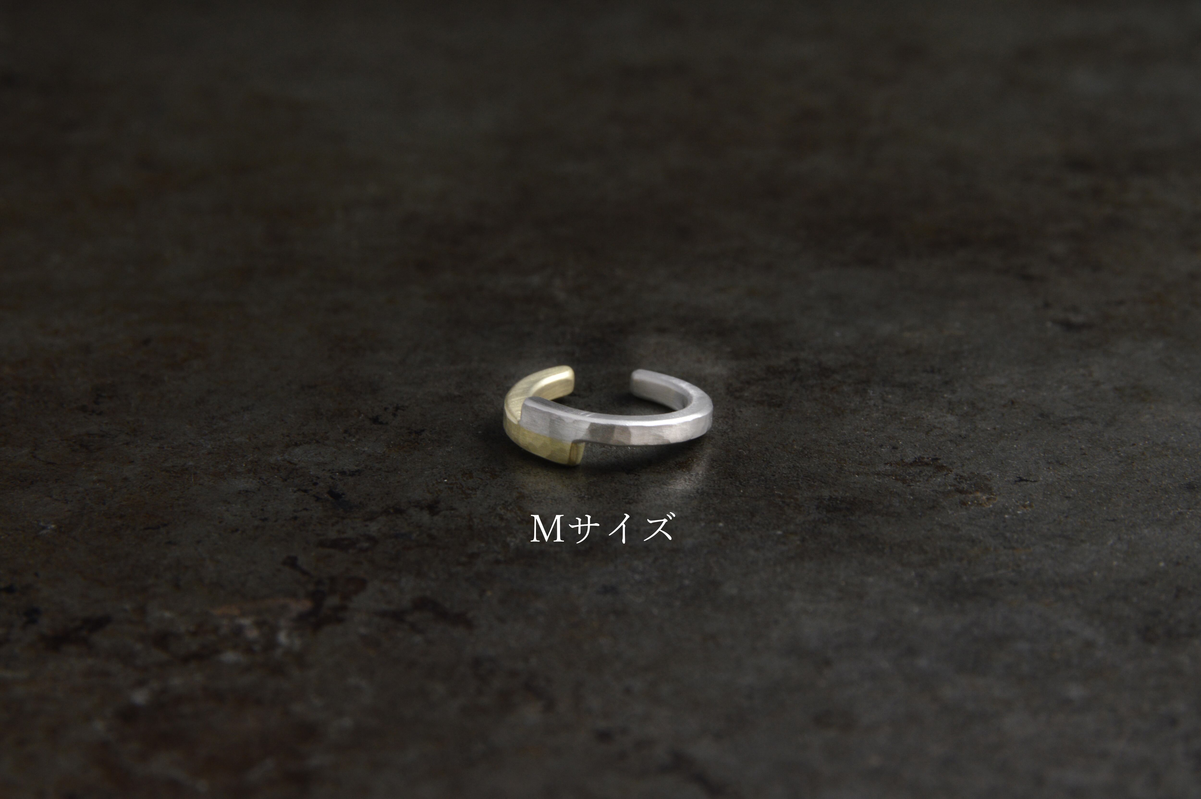 同シリーズのリングやバングルと違い、真鍮と銀が交差する部分を中心からズラしてあります。そうすることで着用時に正面からも側面からも交差部分が見えるようになっています。