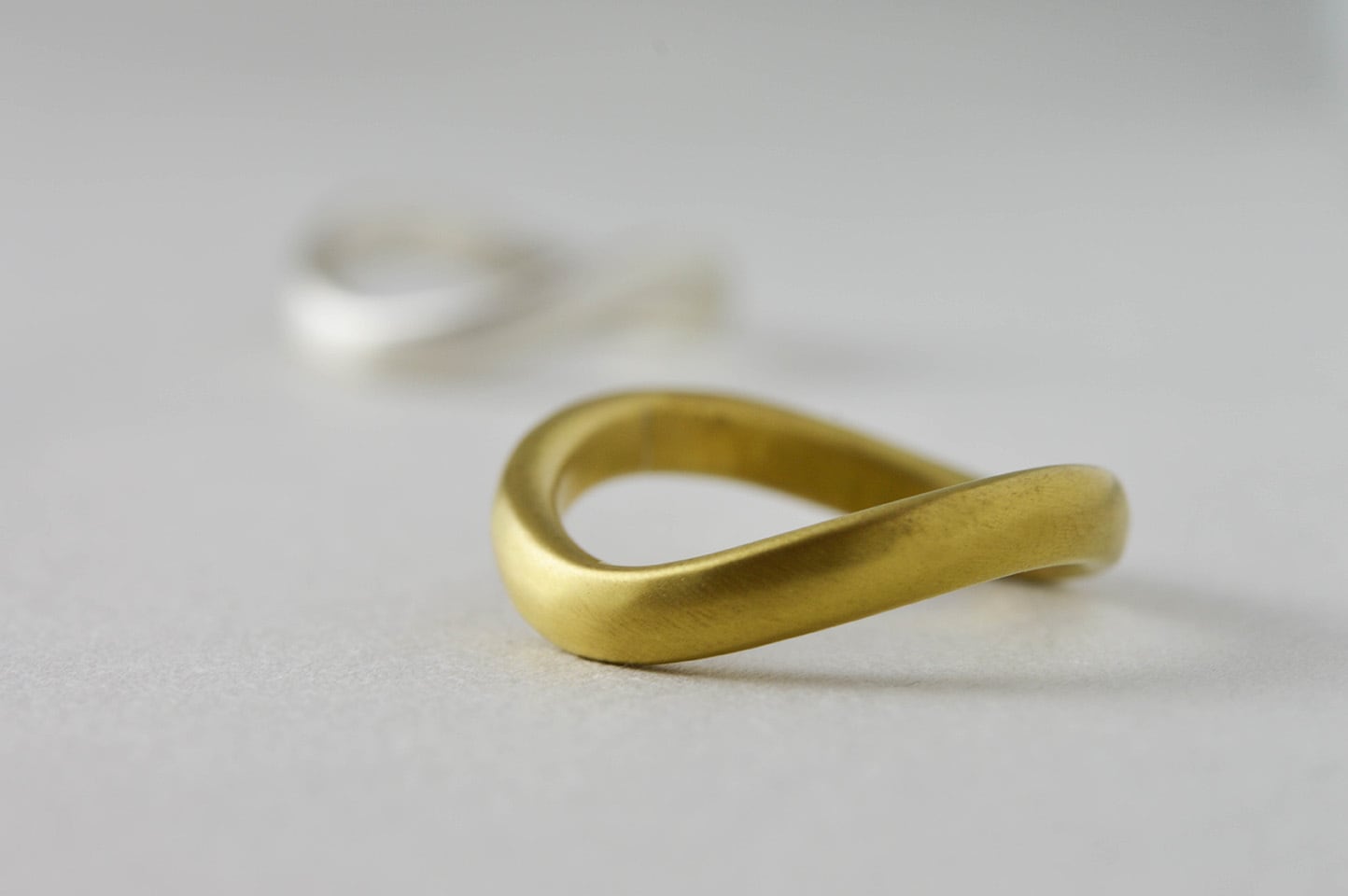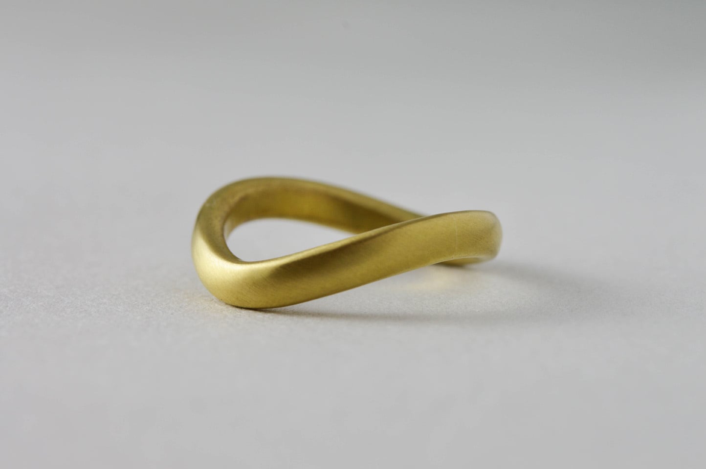 全体が湾曲しているので、身に着けた時にリングの正面をどこにするかによって、雰囲気が変わります。一点着けでは手元を綺麗なラインで飾り、重ね着けの場合は手元に動きを演出してくれます。