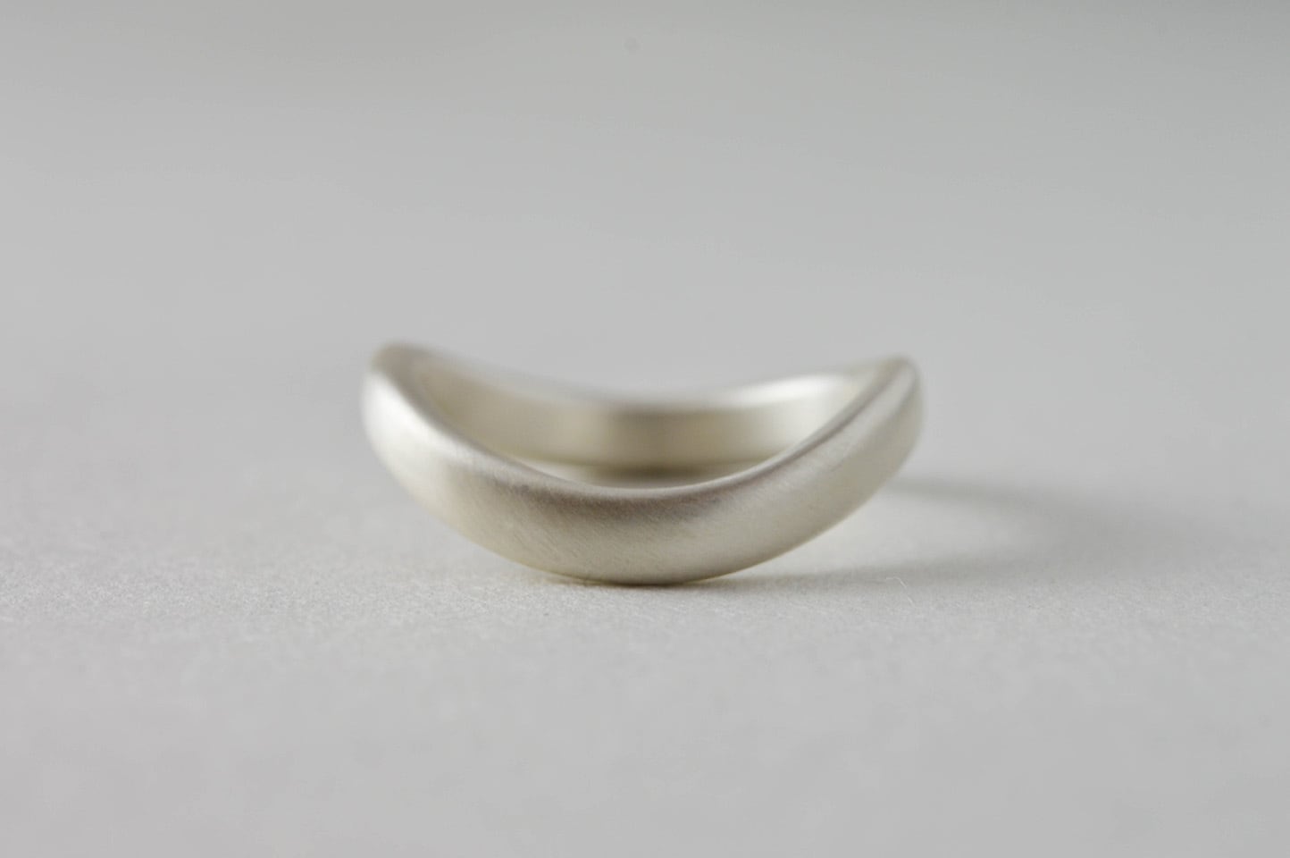 全体が湾曲しているので、身に着けた時にリングの正面をどこにするかによって、雰囲気が変わります。一点着けでは手元を綺麗なラインで飾り、重ね着けの場合は手元に動きを演出してくれます。